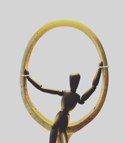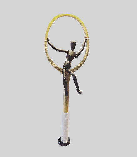 Anyone for Tennis. This original mixed-media sculpture features a tennis racket with an ebony black timber model that appears to be swinging from it. Finishing touches of gold leaf adds an extra luxurious touch. Great for any tennis lover's room.