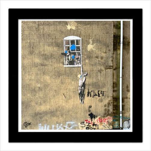 This photo from Mrs Faff's "Bristol Walkabout' series of images depicts Banksy's iconic artwork of a man hanging out of a window in Bristol. There is added graffiti below adding to the urban art.