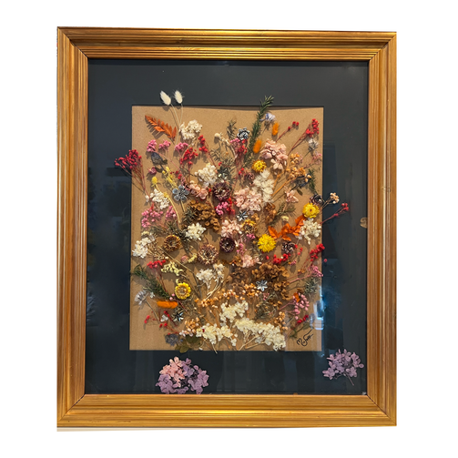 This large work utilises an upcycled frame painted antique gold set onto a navy-blue card background covered with an explosion of dried flowers and metal embellishments. This is a statement piece perfect for those who love gardens and flowers or just something with a splash of colour.