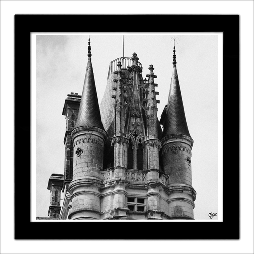 The French castle turret reaches into the sky with cone-shaped turrets covered in dark slate and small Gothic windows. This is a photo all about vertical lines, and symmetry.