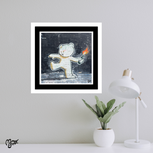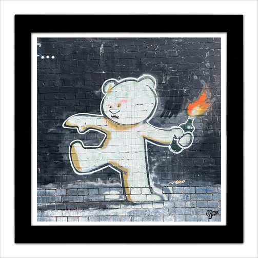 This framed, hand-signed print from Mrs Faff's Bristol Walk About series features Banksy's graffiti bear mid-throw of a Molotov cocktail. The iconic image is sure to add a rebellious but lighthearted touch to any wall.