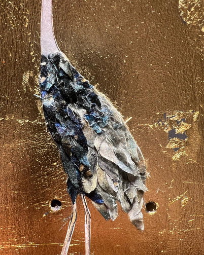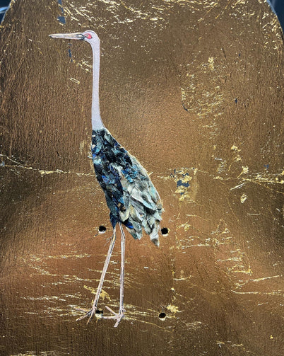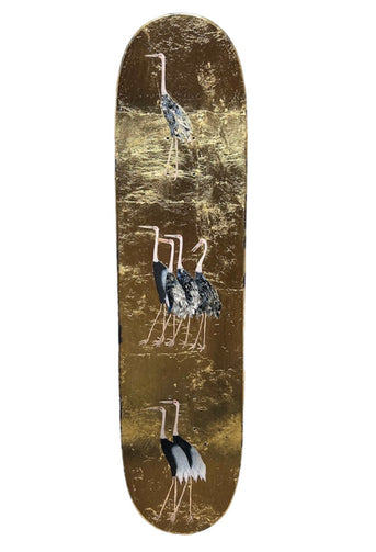 Introducing Japanese Cranes from Mrs Faff's Old World series: a gold-leafed skateboard featuring exquisite craftsmanship and intricate traditional Japanese art. With its graceful cranes that come to life on the skateboard deck, this beautiful work of art is a perfect fusion of urban skateboarding and traditional Japanese art.