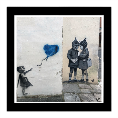 This framed hand-signed print showcases two delightful graffiti works of little people. Captured with the perfect camera angle, the works create an endearing atmosphere that will add a touch of creativity to any space.