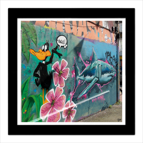 Capture the whimsical moment between the Great White Shark and Daffy Duck with this framed hand-signed print. Featuring lively street art that perfectly intertwines modern culture with a unique artistic representation, this piece is sure to brighten up any room.